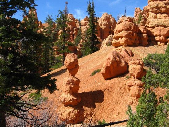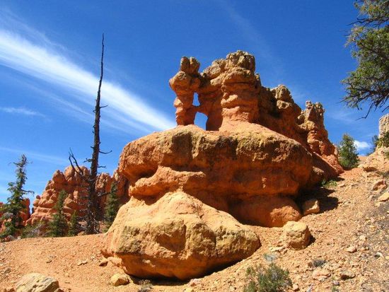 Zuerst ist die Landschaft etwas mager. Dichter Waldbewuchs verhindert den Blick auf die roten Berge, doch das alles ändert sich schlagartig, als der Weg aus dem Wald hinaus den Berg hinauf führt. Da sind sie, die roten Berge, die Felsformationen, die bizarren Kunstwerke, die ich schon immer am Bryce Canyon geliebt habe. Ich fotografiere wie ein Weltmeister. Ich bringe es auf etwa 50 Fotos nur alleine vom Red Canyon. Ich kann mich in diesem Punkt einfach nicht mehr beherrschen. Wenn ich staubige Wüsten mag, dann solche. Wie soll das nur heute Abend im Bryce Canyon werden? Hilfe, ich habe doch nur noch für etwa 700 Fotos Platz auf der Speicherkarte.