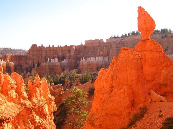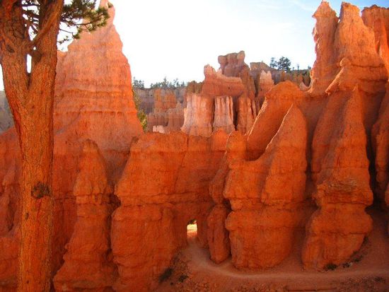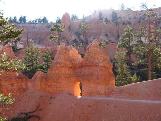 Bevor uns die Sonne ganz verlässt, steigen wir am Sunset Point über den Navajo Loop Trail hinab in den Bryce Canyon. Der Weg teilt sich kurz hinter dem Parkplatz und wir lassen die Münze entscheiden. Über den rechten Weg steigen wir über Serpentinen hinab, begegnen laut keuchenden Gestalten, kriechen unter einer Felswand hindurch und schlendern vorbei an ungewöhnlich gewachsenen Bäumen. Einige Exemplare stehen in einer Art Höhle, in die nur wenig Licht dringt und die Bäume sich daher nah an der Felswald recken, um so noch das meiste Licht abzubekommen.