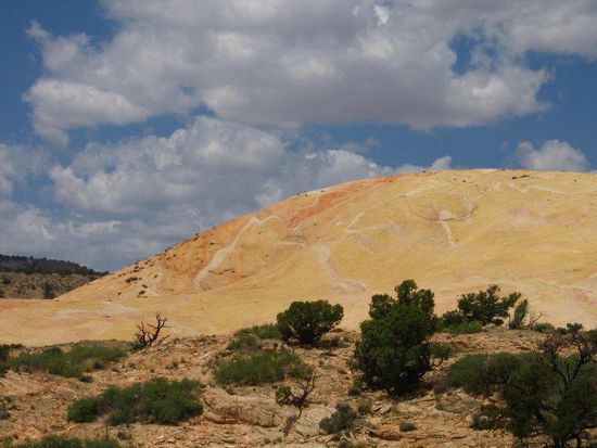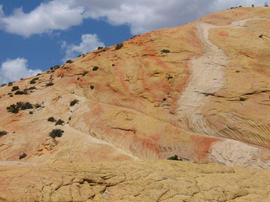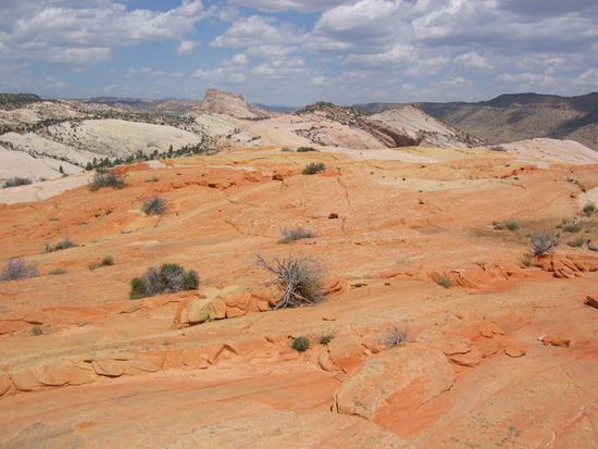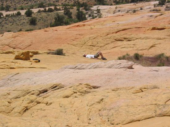 Vor mir liegt ein sehr interessanter Hügel, der Yellow Rock, doch irgendwie begreife ich die Schönheit dieser Landschaft nicht wirklich. Ich bin müde und mir ist unheimlich heiß. Ich sehe, wie die Schatten der Wolken über den Slick Rock huschen und freue mich auf jede Minute, die ich aus der Sonne bin. Ein klein wenig trotte ich Horst noch hinterher, bis ich mir ein schönes Plätzchen suche und mitten auf dem Yellow Rock ein Nickerchen halte. In der Zeit erklimmt Horst den Gipfel. Er wird sicher schöne Fotos mitbringen, da brauch ich nicht auch noch hinterher.