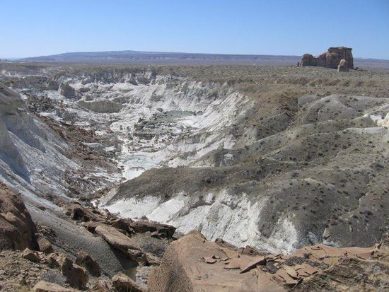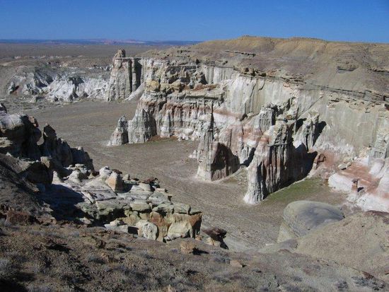 Mit reichlich Durst erreichen wir unser Auto und wenig später links den Sidestep Canyon und erhoffen uns hier, rechts der Straße einen Weg ins Tal zu finden. Anfangs klappt es auch sehr gut. Über kleinere Grade des Coloured Canyon tasten wir uns immer weiter vor, bis wir einen Wash erreichen, der durch absolut weißes Gestein führt. Wo ist meine Sonnenbrille? Kurz nachgedacht - natürlich im Auto. Wir folgen dem Wash um mehrere Schleifen und siehe da - wir stehen vor dem nächsten steilen Abhang. Das Schicksal und die Sonne sind gegen uns, worauf wir dieses Vorhaben nun abbrechen. Vielleicht ein andermal.