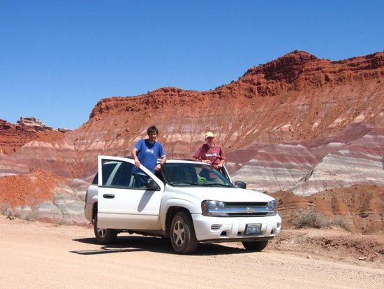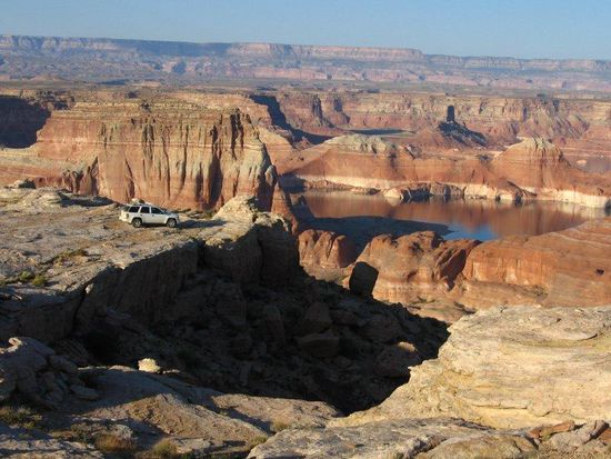 Als die drei nun komplett weg sind, tun wir es ihnen gleich. Was die können, können wir schon lange. Und so muss auch unser Auto für einige schöne Aufnahmen herhalten. Schade, dass es kein neues Modell ist und wir die Fotos keiner Werbeagentur anbieten können. Höchstens für mehr Sicherheit könnten wir werben: "Drive till you dive" Dafür müssten wir aber effektvoll unser Auto im Lake Powell versenken, aber nee, den Wagen brauchen wir noch. Sind ja doch noch einige Meilen zurück nach Page.