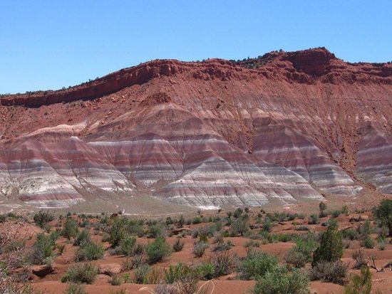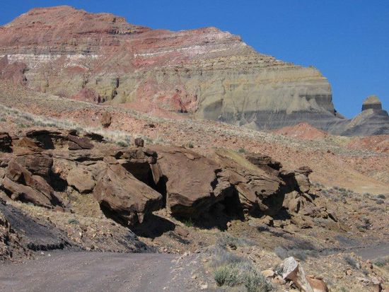 Über die Sand Wash- und Teile der Cottonwood Canyon Road fahren wir zurück zur 89 und vorbei an der schönen Ranger Station mit dem roten Dächlein, in dem es diese heiß begehrten Wave-Permits gibt - was für eine Verlockung - Ruhe, ich schweife ab! Also daran vorbei fahren wir jetzt zur Old Paria, wo es einige sehr schöne bunte Berge und zwei verlassen Saloons zu bestaunen gibt. Auch die Kombination aus Saloon und farbigem Hintergrund ist ein lohnendes Motiv.