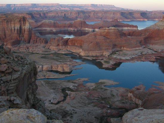 Als großes Highlight des Tages wartet der Alstrom Point auf uns, von dem man runter auf den Lake Powell blicken kann. Das Licht soll hier abends am schönsten sein, also wird unsere Rückkehr sehr spät sein. Daher suchen wir vorher in Page noch ein gemütliches Zimmer für die Nacht. In der Straße der kleinen Motels machen nur noch wenige Häuser einen Eindruck, als ob hier überhaupt noch ein Zimmer vermietet werden würde und diese sind dann auch direkt noch belegt.
