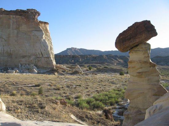 Als nächstes ist die mittlere Gruppe Steinmännchen mit Hut dran. Jeder geht auf seine eigene Entdeckertour und von weitem hört man nur Rufe "du musst mal unbedingt hierhin kommen, von hier ist auch eine gute Aufnahme möglich." Weil Horst noch ein paar Minuten mehr braucht, schlage ich mich durch die Büsche auch noch zur letzten, zur südlichsten Gruppe der Hoodoos durch, doch diese heben sich nicht sonderlich vom Hintergrund ab und geben nicht wirklich viel her. Aber ich bin immerhin einmal hier gewesen. An dieser Stelle führt der Creek sogar noch einen Rest von Wasser. Ein Glück, dass wir heute Nacht nicht weggeschwemmt wurden.