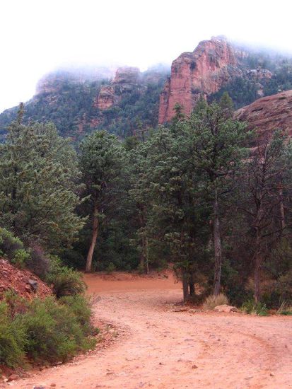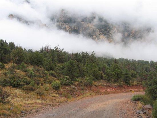 Wir wollen trotzdem versuchen, das Beste aus der Lage zu machen und einige Aussichtspunkte anfahren. Wer weiß, vielleicht ergeben die Wolken zwischen den Bergen ein geeignetes Motiv. Ein wenig Erfolg haben wir zumindest auf der Schnebly Hill Road, einer kleinen Geröllstraße, die Sedona mit der weiter östlich verlaufenden Interstate 17 verbindet. Wir können leider nur erahnen, wie schön die Landschaft im Sonnenschein aussehen mag.