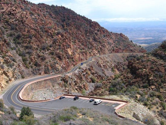 Durch die Kurven ist an ein Überholmanöver kaum zu denken. Auf der einzigen geraden Strecke verschlafe ich fast meine Gelegenheit, hole dann aber noch einmal alles aus unserem Chevy heraus. Ausruhen kann er sich jenseits des Höhepunkts, wenn es ins Prescott Valley hinab geht.