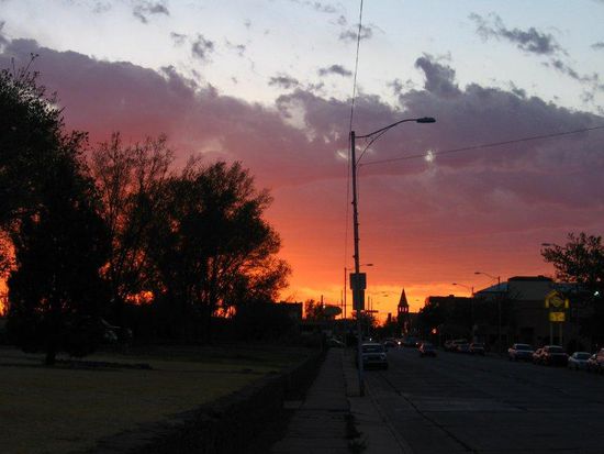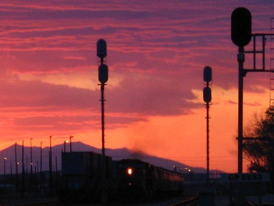 Das Farbspiel am Himmel kündigt einen wunderschönen Sonnenuntergang an, für den wir uns an der Route 66 in Winslow Zeit nehmen werden. Ich habe für meine Fotoreihe den Bahnhof auserkoren. Gegen 19:20 werden die Signale auf grün gestellt, fünf Minuten später höre ich den nächsten Zug in der Ferne tuten und um 20:00 fährt er dann endlich vor. Ich sehe schon. Amerika und Züge - hier muss man viel Zeit mitbringen.