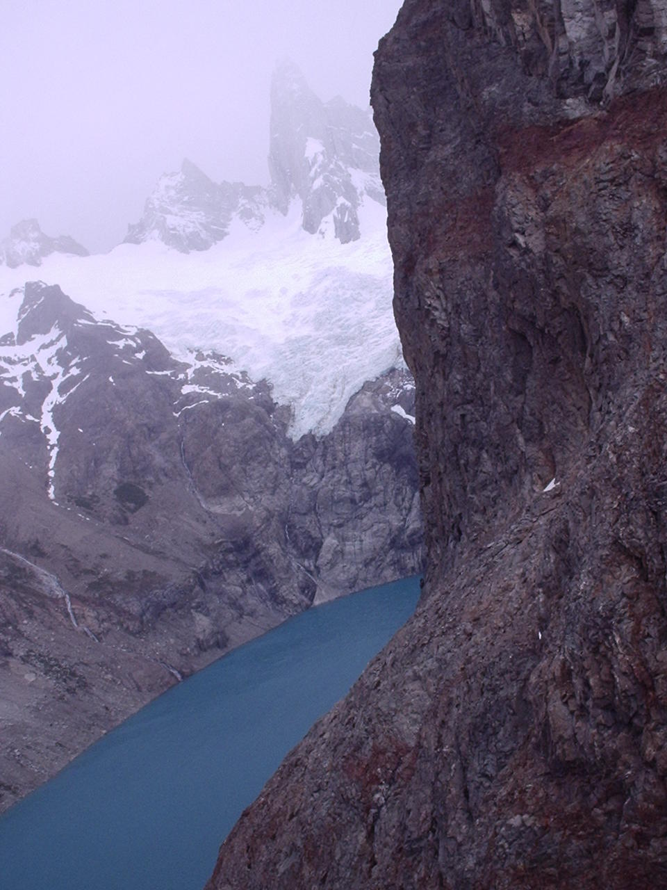 Am folgenden Tag ist es immer noch regnerisch, aber natuerlich zieh ich trotzdem los - bin ja nicht zum vergnuegen hier. Bei gutem Wetter haette man diesmal tolle Ausblicke auf den Cerro Torre, der wohl aehnlich beeindruckend ist wie der Fitz Roy. Immerhin kann ich ihn mir ab und zu erahnen. Das ganze lohnt sich aber trozdem, da man am Ende des Weges gemuetlich auf einer Moraene sitzen kann - vor einem die Laguna Torre und der Glaciar Grande. Bei gutem Wetter sicher traumhaft.