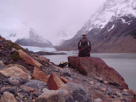 Meine erste Wanderung fuehrt zum Fuss des unglaublich Maechtigen Fitz Roy (urspruenglich El Chalten) Berfmassivs. Der groesste Teil der Strecke befindet sich auf einer Ebene - das einzig Beschwerliche ist der teils wieder starke Wind - und bietet beste Ausblicke auf die Bergspitzen. Ich bin begeistert! Am Ende folgt ein ziemlich steiler Anstieg und als ich endlich oben ankomme und mir die besten Blicke erhoffe, ist alles in den Wolken. Schade. Aber die Muehe hat sich trozdem gelohnt, da sich hier noch zwei schoene Seen befinden, von denen einer halb vereist ist. Hier ist es ganz schoen kalt und es macht halbwegs anstalten zu schneien. Auf dem Rueckweg wird das Wetter dann auch regnerisch - endlich lohnt es sich, die Regenhose mitgenommen zu haben...