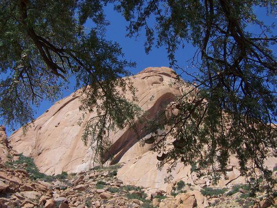 Und weiter zur Spitzkoppe. Hier hätten wir, der ursprünglichen Planung nach, auch eine Nacht campen wollen. Letzten Endes haben wir aber umdisponiert, weil es einfach wesentlich einfacher war, daß Zelt schon in Swakopmund wieder abzugeben, ansonsten hätten wir es von Windhoek irgendwie auf die Reise nach Swakop bringen müssen. Also wurde die Spitzkoppe einfach nur in diesen Tagesausflug integriert - was ich letztlich bereut habe, denn die campsites an der Spitzkoppe sind einmalig schön. Es war brüllend heiß, als wir ankamen und wegen meines Sonnenbrandes war nicht daran zu denken, die Jacke auszuziehen, denn meine verbrannten Arme hätten noch mehr Sonne sicherlich nicht witzig gefunden. So sind wir dann in den irren Felsen herumgeklettert und haben uns natürlich auch die Buschmann-Malereien angesehen, die natürlich nicht so spektakulär sind, wie die White Lady, aber immerhin...Unter einem großen Kameldornbaum haben wir dann Siesta gehalten und auf dem Rückweg den vielen Kindern, die dort Mineralien verkaufen, ein paar Steinchen abgekauft.
