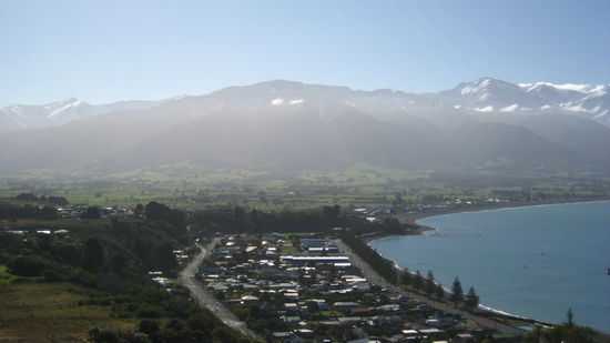 Am naechsten Tag (heute) machte ich einen Track (Sprint in 2 1/2h) auf den Gipfel des Mt. Fuffy (oder so), seines Zeichens Hausberg von Kaikoura und 1602m hoch. Klingt nicht so schlimm, aber Kaikoura liegt am Meer, seht selbst...