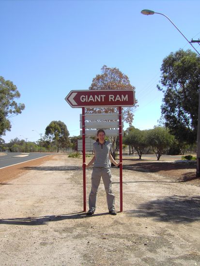 Ostern sollte es also in den Südwesten von Australien zum campen und wandern gehen. Wir waren insgesamt zu 8 und haben uns noch 1 Auto dazu gemietet, da Philip schon eins hatte. Wie immer war die Planung mal wieder kurzfristig und etwas chaotisch. Das lag vor allem daran das einer unserer Mitstreiter in den 3 Tagen vor der Abfahrt 4 mal seine Meinung gewechselt hat, ob er nun mitkommt oder nicht, weswegen ich ihn dann am Donnerstag kurzerhand komplett rausgeschmissen hab. Somit war wieder ein Platz in unseren 2 Autos für Lou frei. Da Lou aber auch ein Auto hat, hatten wir plötzlich 3 Autos zur Verfügung und hätten den Mietwagen gar nicht mehr gebraucht. War aber leider zu spät zum zurückgeben. Letztendlich sind wir dann mit Lous Auto, weil's ein Kombi ist, und dem Mietauto losgezogen und haben das Auto von Philip in Perth gelassen. Naja, da haben wir am Donnerstag Nachmittag die komplette Planung noch mal geändert wo wir ja am Freitag Morgen los wollten. Zwischen dem ganzen Chaos hab ich mir dann noch ne Wohnung angeschaut und war mit Sören und Sebastian Essen einkaufen. Man könnte auch sagen ich war gut beschäftigt. Zu allem Überfluss hat ausgerechnet an diesem Tag das Wetter in Perth beschlossen, aufzuhören nett zu sein und hat sich mit einem gewaltigen Wolkenbruch zu Wort gemeldet. Leider hatte ich mehr aus Gründen der eigenen Faulheit meine Wäsche immer noch auf der Leine hängen, die danach natürlich wieder patsch nass war. Schöner Scheiß, musste ich wohl oder übel mit halbtrockener Wäsche in den Urlaub starten, da die über Nacht natürlich nicht mehr komplett trocken geworden ist. Hat aber am Ende doch alles einigermaßen gut geklappt und wir sind am Freitag um 9 Uhr in Perth losgekommen, um in den Stirling Range National Park, unserem ersten Ziel, zu fahren. Trotz des Karfreitags und Anfang der Osterferien war auf dem Highway nach Albany erstaunlich wenig Verkehr und wir wären eigentlich recht schnell durchgekommen, wenn wir nicht so oft angehalten hätten. Wir waren z.B. in Waggin und haben den Giant Ram angeschaut, was an sich ziemlich bescheuert ist, wenn man nicht zufällig dran vorbei kommt. Es gibt in Australien nämlich die Unsitte, dass, wenn man eine kleine Stadt ist, mitten im Nirgendwo, und absolut nix zu bieten hat, dann baut man einfach was ganz Großes, wie z.B. den Giant Ram. Deswegen gibt's über ganz Australien verstreut auch noch die Big Banana und den Giant Prawn oder eben den Giant Ram in Wagin. Das Ganze ist ziemlich nutzlos aber auch irgendwie sehr sympathisch.