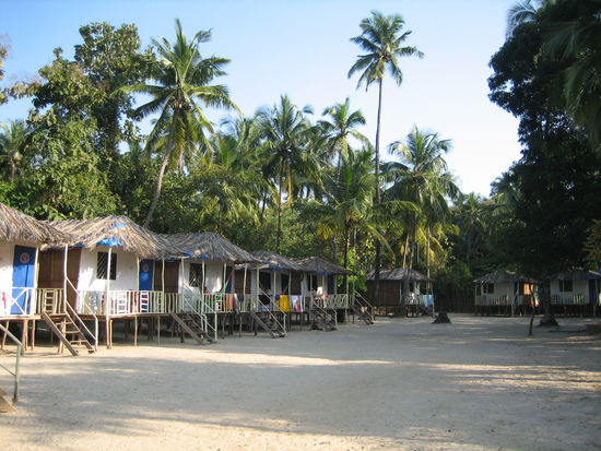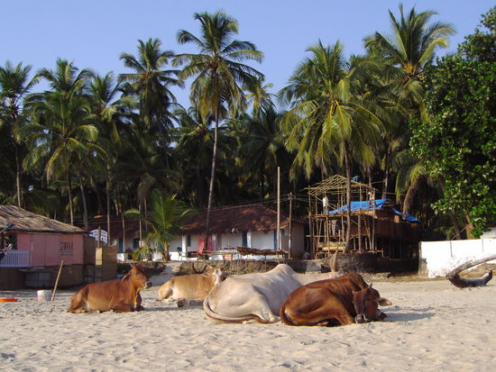 Nachdem wir saemtliche Schwierigkeiten in Jaipur ueberwunden haben und sogar ein Zugticket auf fast direktem Weg nach Goa ergattert haben, machen wir uns auf den Weg ins Hippiparadies Asiens. In Erwartung auf weisse Sandstraende, kristallklares Wasser und Palmen ohne Ende springen wir in der zweitgroessten Stadt Goas nach 11/2 Tagen zugfahren nicht mehr ganz frisch aus der Eisenbahn. Es ist noch viel heisser als in Jaipur oder Bombay. Nassgeschwitzt erreichen wir den Bushof, von wo der Bus nach Palolem, einem ganz beschaulichen, kleinen ruigen Stranddoerfchen abfahren soll. Nach gar nicht allzulanger Zeit haelt auch eine der ueblichen Klapperkisten mit quitschenden Reifen am Strassenrand und der ebenso uebliche Busbegleiter, der normalerweise wie ein Klammeraeffchen draussen am Bus haengt, springt ab und bruellt den Wartenden "Palolempalolempalolempalolem!!!!!!" entgegen. Soweit so gut, da wollen wir hin. Aber nicht nur wir, auch die restliche Bevoelkerung Goas hat offenbar beschlossen einen Strandtag in Palolem einzulegen und eben diesen Bus bestiegen. Der ist naemlich komplet vollgestopft. Weil wir befuerchten, dass der naechste nicht weniger ueberfuellt ist, quetschen wir uns seufzent zwischen die im Bus stehenden und schwitzenden Menschenmassen. Und schwuppdiewupp eine Stunde spaeter kommen wir noch viel nassgeschwitzter und sehr genervt, muede und hungrig in Palolem an. Und werden nicht enttaeuscht. Palmen gibt es en masse, der Strand leuchtet weiss, nur das Meer ist, ganz indialike, mehr kackbraun als kristallblau. Wir schleppen uns mit letzter Kraft den Strand entlang und klappern die unzaeligen Strandhuettendoerfer nach einer billigen Unterkunft ab. Fast wollen wir uns schon damit abfinden, dass wir diesmal wohl nicht mit 3Euro fuer zweit Personen pro Nacht auskommen, als wir ein, zwar nicht direkt am Wasser gelegenes, aber trotzdem wunderschoenes Bambushuetten-Strand-Hoteldoerfchen finden.