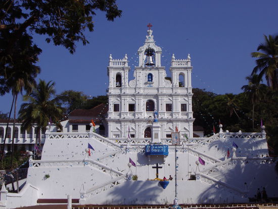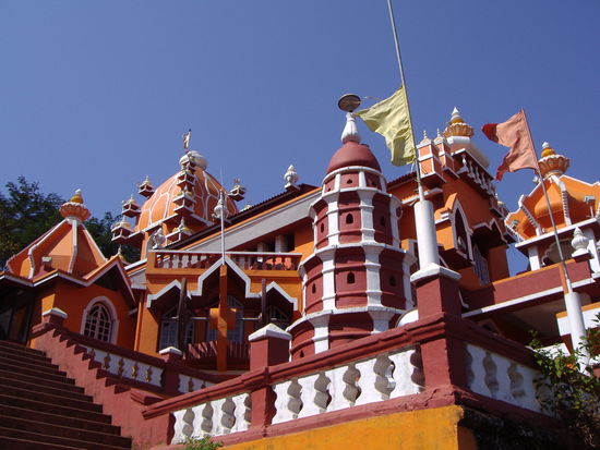 Die portugisische Kolonialherrschaft hat deutliche Spuren hinterlassen. Und angesichts der maechtigen weissen Kirchen, wollten sich die Hindus offenbar nicht lumpen lassen und haben einen wunderschoenen leuchtend orangen Tempel auf einen Huegel ueber die Stadt gesetzt.