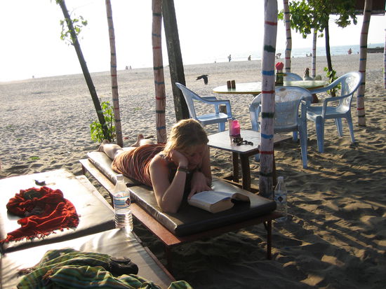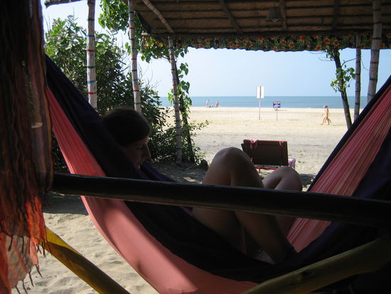 Der naechste Tag ist endlich mein Jubeltag! Wir wollen eigentlich eigentlich einen Roller mieten und zum groessten und aeltesten Hippimarkt Indiens fahren, der jeden Mittwoch stattfindet. Aber das wollen auch alle andern Touristen in Arambol und deswegen ist kein Roller aufzutreiben. Yvonne schenkt mir einen Gutschein fuer eine Ayuvedamassage, die ich auch gleich nach dem Fruehstueck in Anspruch nehme. Nach einer Weile finden wir auch einen Laden, der auch weibliche Masseure hat. Darueber bin ich auch spaetestens nachdem sie mich auffordert mich komplet nackt auszuziehen, sehr froh. Zunaechst laesst sie aus einem speziellen Behaelter warmes Oel auf meine Stirn fliessen und massiert meinen Kopf. Danach beginnt die eigentliche Massage und sie walzt mit viel Oel ueber meinen ganzen Koerper. Nach einer weiteren Stunde wanke ich vollkommen entspannt zurueck zum Strand und lasse mich in die Haengematte vor unserer Huette fallen (wir sind inzwischen umgezogen).