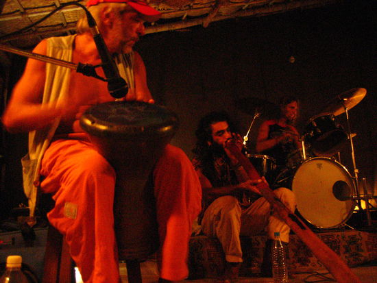 Schliesslich ergreift der Oberhippi das Mikri und performt einen ganz speziellen Didgeridoo-am-Strand-von-Arambol-Song (irgendwas von "create your own reality"). Ich schaue mich ain bisschen um hier wird wirklich meine Klischeevorstellung von Goa zum Leben erweckt. Auf der Tanzflaeche wiegt sich ein ziemlich zugedroenter, braungebranter, zotteliger Opi im Takt der Musik, an der Bar sitzt die dazugehoerige Omi und dreht sich einen Joint.