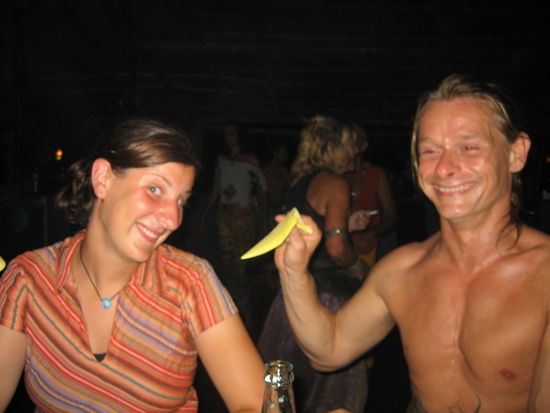 Abends gehen wir in ein kleinen Restaurant dass auf den Felsen direkt ueber dem Meer liegt und essen zur feier des Tages Seefoot. Wir bestellen eine Platte fuer drei Personen und bekommen zwei koestliche Fische, viele Garnelen und Tintenfisch. Dazu gibts Salat und Pommes. Der Spass kostet uns 12 Euro. Nach einem abschliessenden Supernachtisch laufen bzw. rollen wir zu der Bar, in der wai schon am ersten Abend gegessen haben, den von dort hoert man wieder Livemusik. Das vorgestern war offenbar nur eine Probe, denn heute bietet uns die Band alles was zu einem Konzert dazugehoert. Sie sind zwar nicht wirklich gut, machen aber eine Bomben Stimmung. Die Tanzflaeche wir von einer riesen Horde Klischee-alt-68er gestuermt. Der naechste Programmpunkt ist ein Didgeridoospieler. Wir setzen uns direkt vor der Buehne auf den Boden und bekommen promt jeder eine Art Rassel in die Hand gedrueckt. Die Band und das Publikum machen alle einfach irgendwelche Geraeusche zu den Klaengen des Didgeridoo und das Ganze hoert sich sehr cool an.