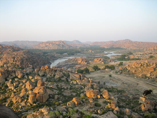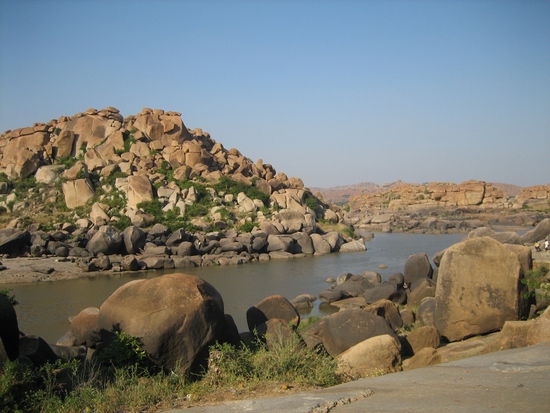 Am Nachmittag fuerte uns unser Guide dann durch dir Ruinen und erzaehlte uns so einiges ueber Geschichte dieser Stadt und die Religioesen Hintergruende. Es war sehr interessant und die Landschaft der Umgebung war irgentwie lustig. Hampi ist umgeben von riesigen Steinhaufen und einem Fluss