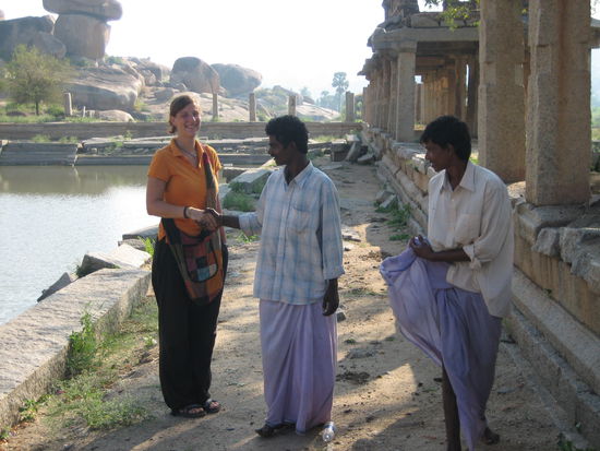 Am naechsten Morgen unternahmen wir mir unserem Guide eine kleine Fahrradtour, da das Gelaende recht weitlaeufig war. Schon bei der ersten Station begegneten uns drei Inder, die Fotos mit uns machen wollten. Ich lehnte dankend ab, aber Helena hatte konnte es nicht uebers Herz bringen sie zu entteuschen. Es folgten Fotos bei denen jeder einmal Helena die Hand schuetteln durfte: