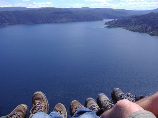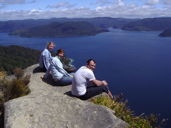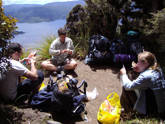 Gleich die erste Etappe fuehrte 600 Hoehenmeter bergauf und wir kamen ganz schoen ins schwitzen, aber immer wieder kamen wir an den Rand des Waldes und wurden mit einer gigantischen Aussicht ueber den Lake Waikaremoana belohnt. An solch einer Stelle haben wir dann auch auf den Klippen eine ausgedehnte Mittagspause eingelegt und jede Menge Fotos geschossen.