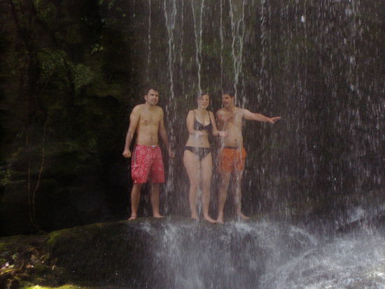 Am Morgen des dritten Tages wollten wir zunaecht zu einem Wasserfall laufen, von dem wir auch gehoert hatten, dass man sich unter ihn stellen und in dem Becken, in das er sich ergiesst, baden koenne. Nach einer halben Stunde hatten wir ihn auch schon erreicht, doch mussten wir erst einige Zeit nach einem geeigneten Abstieg suchen. Das Wasser war super kalt!!! Schon nach einigen Sekunden waren meine Fuesse so verkrampft, dass sie schmerzten. Und wer Philipp auf dem Foto betrachtet, kann sich vorstellen wie kalt es war. Die tiefen Temperaturen konnten allerdings Helenas Ergeiz nicht brechen sich vor den Wasserfall stellen zu wollen, wofuer man aber zunaechst durch das Becken schwimmen musste. Nach einigen Minuten hatte sie sich auch an die Kaelte gewoehnt und hoerte auf zu jappsen. Die beiden Jungs konnte sie noch ueberzeugen ihr zu folgen, aber ich begnuegte mich lieber damit den drein beim frieren zu zu schaun.