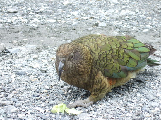 Auf dem Parkplatz des Fox Gletschers sass ein Kea. Ein Neuseelaendischer Papagaei, ein ziehmlich grosser Papagei! Er war gerade dabei ein Sandwich zu essen, das ihm ein paar Touristen zugeworfen hatten, obwohl es eigendlich verboten ist wilde Voegel zu fuettern.