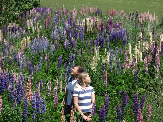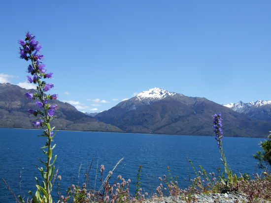 Wieder auf der Strasse Richtung Te Anau konnte wir die wunderschoene Natur mit ihren glasklaren Fluessen, schneebedeckten Bergspitzen und bunten Blumenfeldern bewundern.