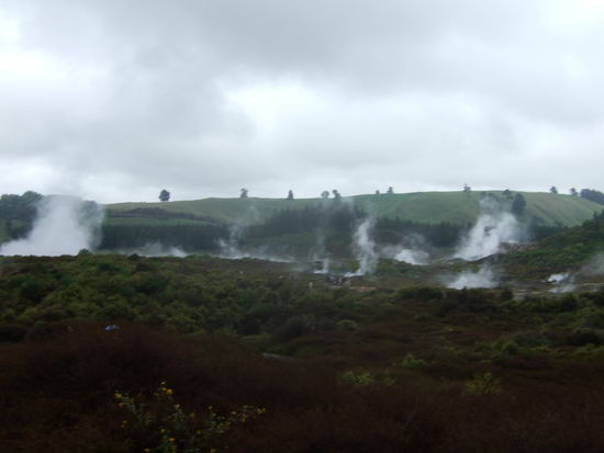Es gab auch 2 Geysire, die wir aber leober nicht aktov gesehen haben. Nachdem wir unsere Runde beendet hatten,. wollten wir nun doch mal einen Gysier ausbrechen sehen und setzten uns auf eine Bank diereckt gegenueber. Es war die Ganze Zeit am regnen, aber gluecklicherweise konnten wir uns am Eingang einen Regenschirm ausleihen. so sassen wir nun da und warteten und warteten....Philipp war schon kurz davor zu gehen, aber Helena und ich wollten bleiben und meinten schon "wir bleiben hier so lange sitzen bis das scheiss ding los geht!!" Doch dann meinte Helena "Ich frag mal den Bootsfuehrer in welchen Abstaenden der ausbricht" (Man musste sich naehmlich von einem Boot zu dem Park fahren lassen, dass die ganze zeit ueber einen See paendelt)