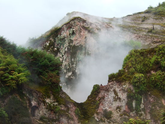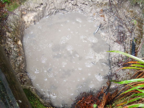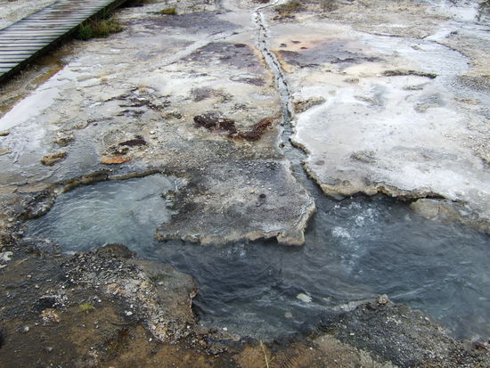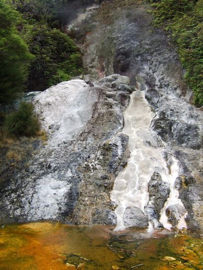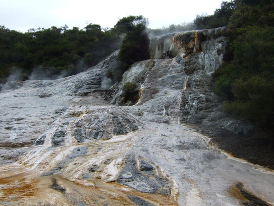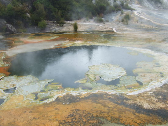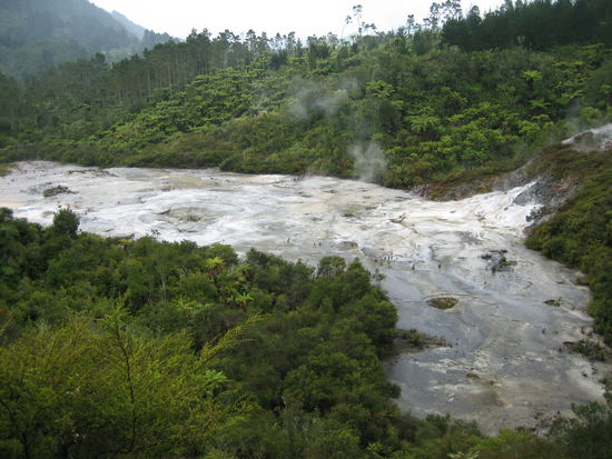 Orakei Korako war schon um einiges cooler. Dieser Park liegt etwa auf halber Strecke zwischen Taupo und Rotorura. Hier bekamen wir einige Heisse Quellen zu sehen, deren Wasser sich ueber eine Breite Flaeche ergoss und dort bunte Algen wachsen lies. Ausserdem gab es einige brodelde Schlammbecken riesige Krater aus -keine Ahnung was -aber es sah alles voll interessant und bizar aus. Es gab auch eine Hoehle an deren Ende ein tuerkises Wasserbecken war. Das Wasser war so klar, dass man probleme hatte zu sehen ab wo die Steine unter der Wasseroberflaeche lagen.