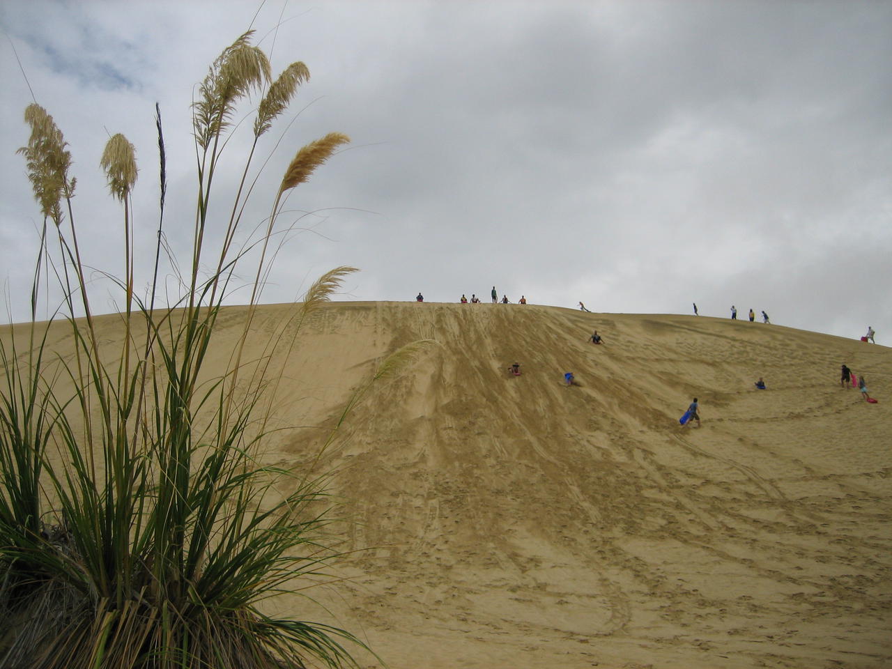 Nach etwa 60 Killometern verliessen wir den Strand und hielten an einer riesigen Duene wo wir mit Schlitten runter fahren konnte, doch zunaechst musste der etwas anstrengende Aufstieg ueberwunden werden. Oben angekommen kostete es erstmal ein wenig Ueberwindung los zu fahren, aber dann gins ab!