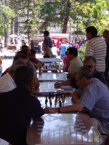 In der Mitte steht ein grosser Pavillion, in dem ein paar Maenner Schach spielen, was von unglaublich vielen Zuschauern begutachtet wird.