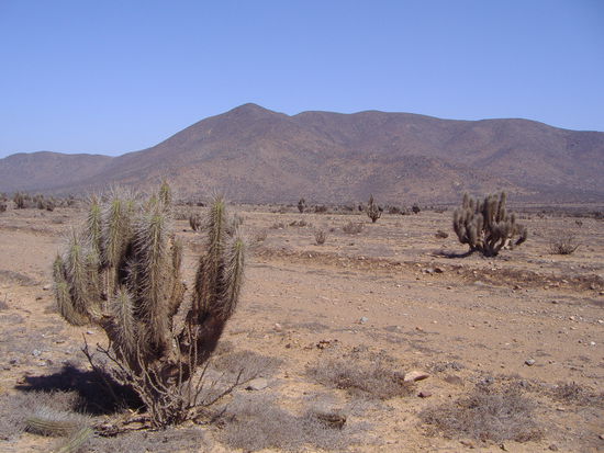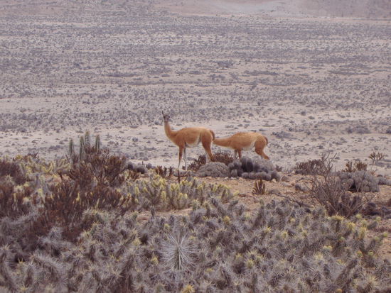 Nachdem wir uns mal wieder mitten in der acht aus dem Bett gequaelt haben, werden wir fast puenktlich so gegen acht vor unserem Hostal von einem dicken Chilenen, der ueberraschender Weise perfekt Englisch spricht, in einem Kleinbus abgeholt.Zunaechst fahren wir erstmal ein gutes Stueck ueber die Panamerikana in richtung Norden. Irgedwann biegt unser Fahrer dann in eine nicht betonierte Schotterstrasse ein und wir fahren mitten durch die Wueste. Man kann meilenweit sehen und es gibt nichts als Erde und riesige Kakteen. Es ist kaum zu glauben, aber in dieser Einoede gibt es offenbar tatsaechlich massenhaft Tiere und so laufen uns ploetzlich diese beiden wilden Lamas, sogenannte Vecuñas ueber den Weg.