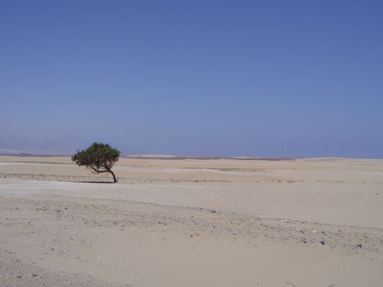 Als wir wieder festen Boden unter den Fuessen haben, steigen wir wieder in unseren kleinen Bus. Jetzt geht es erstmal durch eine Sandwueste und dann wieder in die felsige Kakteenwueste, die jetzt, wo die Sonne richtig vom Himmel kanllt noch beeindruckender wirkt.