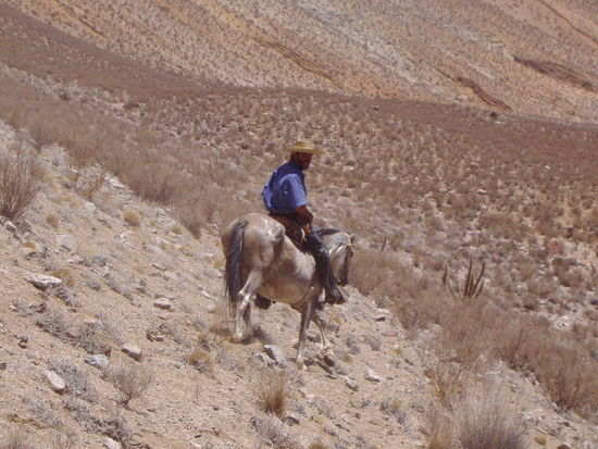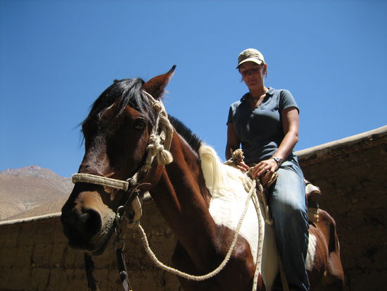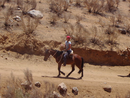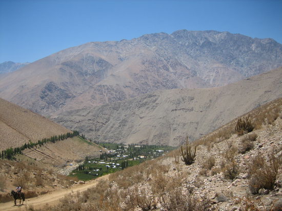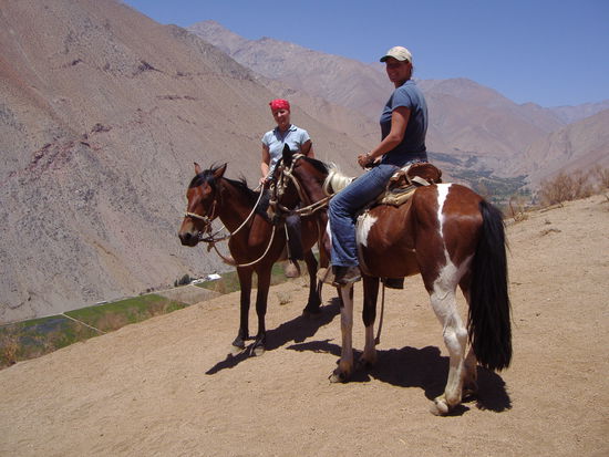 Am naechsten Tag fahren wir morgens mit dem Bus ins Valle de Elqui, einem Tahl in der Wueste, durch das ein Fluss aus den Bergen fliesst und das deswegen sehr gruen und voller exotischer Fruechte sein soll. Ausserdem gibt es hier eine der groessten Piscobrennerreien des Landes. Pisco ist das chilenische Nationalgetraenk. Riecht gut, schmeckt aber scheisse, oder, um es in den Worten eines kleinen neuseelaendischen Maedchens zu sagen, "it looks delicous, but it tastes disgusting"! Und weil wir finden, dass wir auf unserer bisherigen Reise schon genug gelaufen sind, beschliessen wir das heute mal anderen zu ueberlassen und mieten uns bei Ramón zwei kleine Pferde. Um zwoelf solls losgehen. Weil wir die ersten sind, duerfen wir uns zwei Pferde aussuchen. Nachdem Ramón uns jedes vorgestellt hat, entschliesse ich (Helena) mich fuer ein kuhfarbiges Pferd (ich hab leider seinen Namen vergessen, aber er hiess wie irgendeine Blume), dass zwar sehr gemuetlich und ruhig sein soll, aber am schnellsten von allen gallopieren kann.