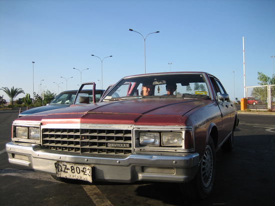 Nach einer gefuehlten 6453 Std. Busfahrt erreichen wir Arica, ganz im Norden von Chile an der Grenze mit Peru. Das trifft sich ausgezeichnet, denn genau da wollen wir hin. Nachdem wir erfahren haben, dass der naechste Bus theoretisch in 20 Minuten und praktisch (ganz indialike) erst wenn er voll ist abfaehrt, lassen wir uns von einem der zaehlreichen auf uns einredenden Colectivofahrer abschleppen. Nachdem die Formalitaeten zu Grenzueberquerung geklaert sind und unser Fahrer sein seeeehr ausgepraegtes Gespraech mit der Beamtin beendet hat, werden wir in ein... aehm... ich moechte mich an dieser Stelle nicht dazu hinreissen lassen eine Vermutung ueber die Marke des Wagens zu aeussern und mich damit vor dem ein oder anderen autobegeisterten (um nicht zu sagen -fanatischen) Bekannten bis in alle Ewigkeit laecherlich zu machen und bestaetige lieber ein allseits gefestigtes Vorurteil und sage mal: sehr schoenes, sehr altes, rotes Auto (siehe Foto)