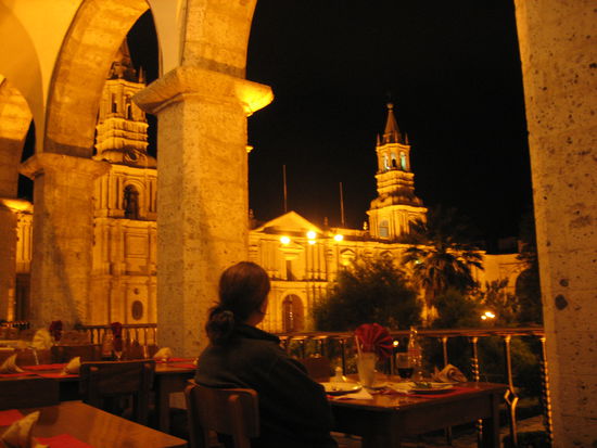 Wir gehen erstmal in einem der zahlreichen Restaurants auf den Balkons ueber den Bogengaengen der Kathedrale rund um den Plaza de Armas ein fantastisches Menue fuer schlappe 3,50 Euro essen und fallen dann hundemuede in unsere Betten.