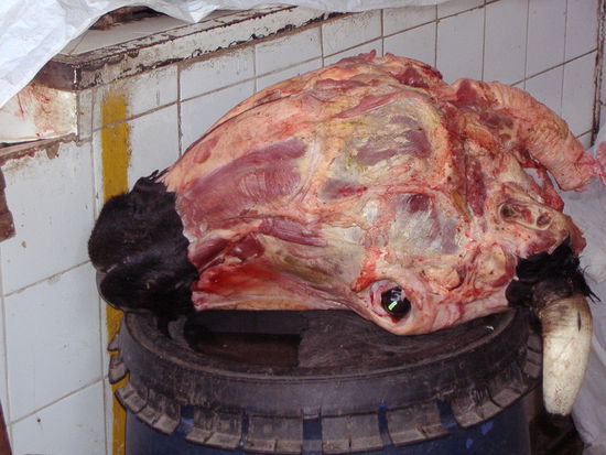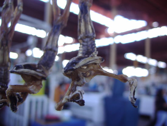 Im naechsten Gang ist die Schweineabteilung. Hier kann man halbe Schweinekoepfe fuer eine sehr schmackhafte Suppe, wie man uns versichert, kaufen. Weiter gehts durch die Fischabteilung, wo es getrocknete Froesche (ebenfalls fuer eine Suppe oder als Potenzmittel) gibt.