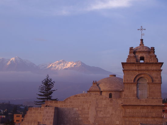 Ich piesacke ihn vier Stunden lang mit meinen Knien, bis er endlich einsieht, dass es sowahl fuer seinen Ruecken als auch fuer meine Knie gemuehtlicher ist, wenn er einfach fuenf Zentimeter weiter aufrecht sitzt. Beschwingt von diesem Teilsieg erreichen wir 3 Stunden spaeter Arequipa. Wir sind nicht wirklich gut vorbereitet und wissen nur, dass es sich hierbei um eine wunderschoene Stadt, deren Haeuser zum groessten Teil aus weissem Vulkangestein gebaut sein sollen und wo man fantastisch Spanischkurse machen kann (das haben wir auch bitter noetig, die Englischkenntnisse der meisten Suedamerikaner, mit denen wir zu tun hatten, nicht ueber hi und thank you hinausgehen). Deswegen sind wir ziemlich ueberrascht als wir an dem Bushof dieser zweitgroessten Millionenstadt Perus ankommen. Der Reisefuehrer empfiehlt ein Hostal direkt am Bushof, aber die gegend gefaellt uns gar nicht. Obwohl ich hier von einem total besoffenen, ziemlich abgewrakten Typen ohne Schuhe einen Sol zugesteckt bekomme, was mich daran erinnert, dass ich dringend duschen und meine Klamotten waschen sollte . Wir lassen uns also von einem der 25000 kleinen gelben Taxen Arequipas in die Innenstadt fahren, wo wir ein superschoenes, ganz neues Hostal mit Dachterasse finden. Von hier aus kann man sowohl die zum greifen nahen Berge, als auch die, mit viel gutem Willen, weissen umd wirklich schoenen Gebaeude aus der Kolonialzeit, wie z.B. die Kathedrale, bestaunen.