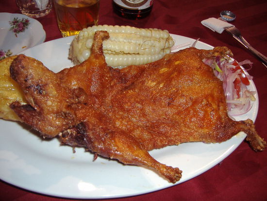Anschliessend ringen Yvonne und ich lange mit uns, aber schliesslich schnappen wir uns abends ein Taxi und lassen uns in das Peruanische-Spezialitaeten-Restaurantviertel bringen um DIE klassisch peruanische Spezialitaet der Anden zu testen. Obwohl es erst sieben ist, macht das Restaurant, das uns empfohlen wurde schon zu. Spaeter finden wir raus, dass in diesen Testaurants ueblicherweise zu Mittag gegessen wird. Aber wir finden zum Glueck noch ein anderes. In der riesigen, neonlichterleuchteten Halle spielt in einer Ecke eine siebenkoepfige Salsaband und saemtliche Gaeste tummeln sich auf der Tanzflaeche. Wir bleiben aber an unserem Tisch und bestellen wild entschlossen Cuy Chactado, gebratenes Meerschweinchen. Der Trommler der Band hat sich spontan in uns verliebt und kommt kaum mit dem Trommeln nach, weil er uns staendig zuwinkt. Und dann gesteht auch der Saenger "I love you girls!". So vergeht die Zeit ziemlich schnell und zack werden auch schon unsere beiden kleinen Nager aufgetischt. Ein bisschen gruselig ist es schon, dass man saemtliche Detaills, wie Zaehne, Augen und Krallen noch ziemlich genau erkennen kann. Und weil ich mir nicht beim essen zusehen lassen will, muss ich mein Tier erstmal koepfen und den Kopf unter einem Salatblatt verstecken. Dann schmeckt es eigentlich ziemlich gut. Leider besteht das arme Tier aber aus mehr Knochen als Fleisch und ist deswegen ziemlich schwer zu essen. Das ganze schmeckt wie Huehnchen, also eher unspektakulaer, aber was tut man nicht alles fuer ein Foto.