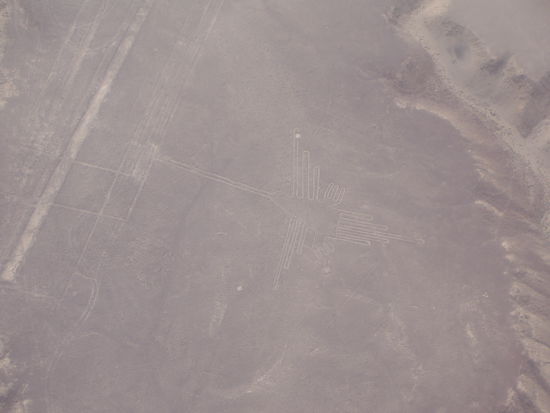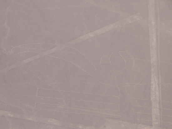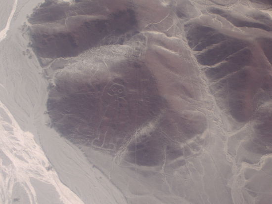 Der Pilot fliegt erst einen super engen Linksbogen und dann einen noch engeren Rechtsbogen ueber dem Kleinen Huegen und mein Magen schlaegt Purzelbaeume. "Look my friend, look, look!" Fordert e runs immer wieder ueber die Headsetzs auf, und dann traellert er "relax, relax, relax". Aber das ist leichter gesagt als getan, wenn man die ganze Zeit damit beshaeftigt ist den aufkommenden Wuergereflex zu unterdruecken. Bald schon erreichen wir die naechste Zeichnung. Einen riesigen Affen. Wir drehen wieder unsere Boegen und es folgen eine Spinne, ein Kolibrie, ein Papagei, eine Art Haende, ein Baum und ein Pelikan. Leider war es ziemlich schwerd die Abbildungen zu fotografieren und sie sind auf den Fotos auch nur schwer zu erkennen. Deswegen beispielhaft hier die besten.