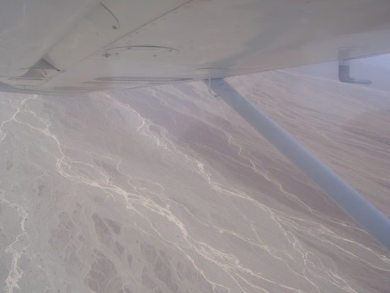 Wir nehmen Platz, der Pilot begruesst uns und der kleine Mann scheucht nun das Flugzeug auf die Start und Landebahn. Wir haben grade noch Zeit unsere Headsets aufzusetzen, da geht es auch schon los. In diesem winzigen Flugzeug ist das Fliegen eine ganz schoen wacklige Angelegenheit und mir ist ein bisschen mulmig. Wir fliegen ueber eine total trockene wuestenartige Lanschaft