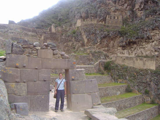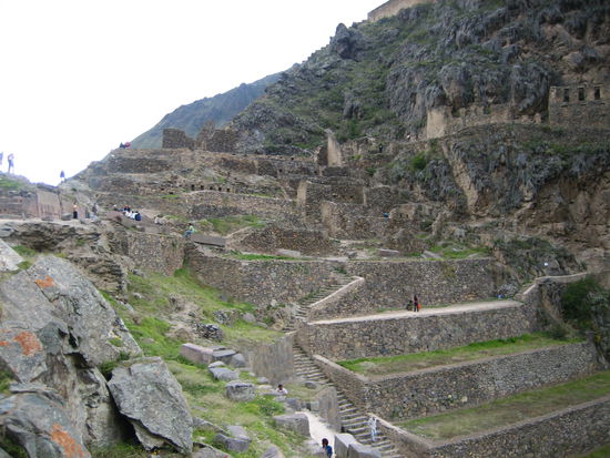 Gegen zwei Uhr Nachmittags besteigen wir einen kleinen Klapperbus, der etwas an das Model Nepal erinnert und auch aehnlich vollgepackt Word. Wir ergattern aber zum Glueck zwei Sitzplaetze. So geht es durch eine wunderschoen, ich muerde sagen typisch peruanische Landschaft in Richtung Urumbamba. Dort steigen wir in einen Colectivo-VW-Bus um und duesen, zusammen mit 23 (¡) anderen Leuden in 20 Minuten nach Ollantaytambo, wo unser Zug nach Aqua Caliente, dem Dorf das Machupicchu am naechsten gelegen ist, abfaehrt. Fuehr die 2stuendige Zugfahrt mussten wir sage und schreibe 44Dollar (return) blechen! Zum Vergleich: die vorrangegangene 2stuendige Busfahrt hat 75 Cent gekostet. Die Touristen werden hier manchmal echt gemolken wir fette Milchkuehe! Bis zur Abfahrt bleiben uns aber noch ein paar Stunden Zeit und deswegen gucken wir uns vorher die Inkaruinen in Ollantayambo an. Die sind auch wirklich ganz sehenswert uns "kleben" an den steilen Haengen ueber dem Ort.