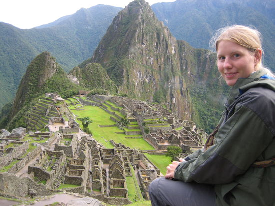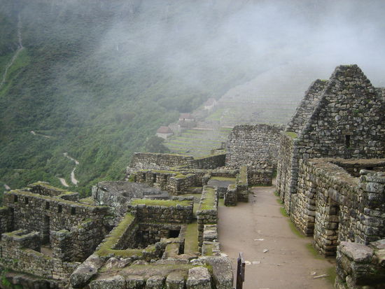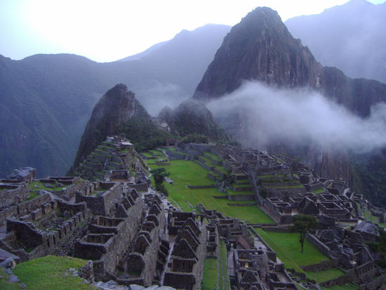 Inzwischen ist es stockdunkel und es regent in Stroemen. Deswegen bekommen wir von der angeblich wunderschoenen Landschaft nicht viel mit und erreichen zwei Stunden spaeter ziemlich durchgeschuettelt unser Ziel. Weil es immernoch regent, als wuerde die Welt untergehen und wir keine Ahnung haben wos langeht, lassen wir uns von einer der um die wette bruellenden Frauen am Bahnhof zu ihrem Hotel abschleppen. Das Zimmer mit eigenem Bad ist auf den ersten Blick sehr schoen, auf den zweiten aber feucht und angeschimmelt. Naja, trockener als draussen ist es allemal und deswegen fallen wir auch schon bald in die feuchten, unangenehm duftenden Betten. Der Wecker scheucht uns aber schon wenig spaeter wieder heraus. Wir quaelen uns also um halb fuenf Morgens aus den Betten. Es regent immernoch in Stroemen und deswegen beschliessen wir nicht zu laufen, sonder den ersten Bus um halb sechs zum MachuPicchu zu erwischen. Wir wollen schliesslich als Allererste um sechs, wenn dort Oben die Pforten oeffnen, vor Ort sein. Wir kaufen uns also erstmal am Touristenbuero ein Eintrittsticket (ein alter knollennasiger Mann weisst uns erst auf Spanisch muendlich und dann auf englisch schriftlich mit einem grossen Schild, da e runs vor die Nase haelt darauf hin, dass das notwendig ist) und dann an der Haltestelle ein Busticket fuer unverschaemte 6 Dollar! Dann klappt auch zum Glueck alles super, der Bus fahrt uns den Steilen Berg hinauf und punktlich um sechs Uhr stehen wir vor der noch verschlossenen Tuer. Genauso puenktlich hoert es auf zu regnen und das ersteb Licht des Tages setzt sich durch. Zusammen mit ca. 10 anderen Touristen werden wir dann auch wenig spaeter eingelassen. Wir steigen erstmal auf die Terassenfoermigen Ebenen etwas oberhalb der eigentlichen Stadt, von wo au man einen fantastischen Blick auf MachuPicchu hat. Das Licht ist noch ein kleines bisschen schummrig und Wolkenschwaden haengen gespenstisch ueber den Ruinen der 500 Jahre alten Stadt, die majesttaetisch auf den steilen Flesen trohnt.