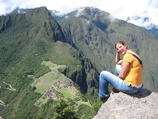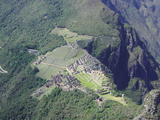 Gegen acht fuellen sich die Ruinen langam mit Touristen. Wir haben gehoert, dass das die Zeit ist, zu der die Inkatrailer ankommen. Weil wir das meiste schon gesehen haben, beschliessen wir gegen neun den steilen Felsen hinter dem MachuPicchu zu erklimmen, von dessen spitze man einen noch fantastischeren Blick haben soll. Eine knappe halbe Stunde spaeter verfluchen wir diesen Entschluss aber schon wieder. Der Weg fuehrt megasteil ueber super hohe Steinstufen unendlich lange bergauf.