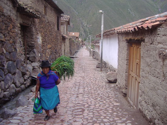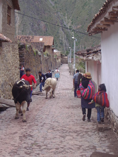 und erreichen nach knapp anderthalb Stunden ziemlich erschoepft unsere Unterkunft. Kaum haben wir wieder ein Dach ueber dem Kopf, verschwindet die strahlende Sonne blitzartig und es faengt wieder wie aus Eimern an zu giessen. Da haben unsere zahlreichen Gluecksbringer mal wieder ganze Arbeit geleistet. Wir gehen noch in einem der 1000 Restaurants was essen und fallen anschliessend erschoepft ins Bett. Am naechsten Morgen muessen wir schon wieder um halb fuenf raus, weil unser Zug um viertel vor sechs abfaehrt und wir aus irgendeinem Grund eine halbe Stunde vorher da sein sollen. Gesagt getan, wir sitzen puenktlich wie die Maurer im Zug, und als es dann endlich los geht ist auch schon die Sonne aufgegangen, so dass wir diesmal die schoene Landschaft bestaunen koennen. Leider sitzen wir aber auf der falschen Seite, so dass uns das Beste entgeht. Zwei Stunden spaeter erreichen wir wieder Ollantayambo. Wir schlendern noch ein bisschen durch die kleinen Gassen des Ortes und ueber einen kleinen Markt und fotografieren so unauffaellig wie Moeglich die Bewohner.