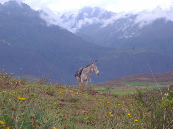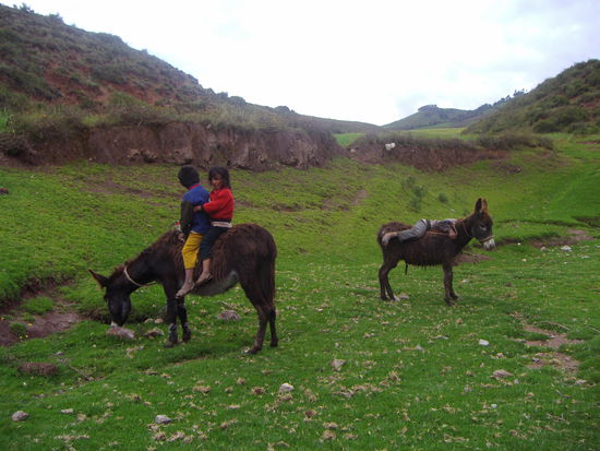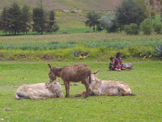 Dann nehmen wir das naechste Colectivo, dass mal wieder rappelvoll gestopft wird. In Urumbamba erkundigen wir uns, sinnfreier Weise bei den Taxifahrern, wie man am besten und billigsten nach Moray kommt. Moray sind ganz speziellen Inkaruinen, die wir uns noch ansehen wollen. Natuerlich erzaehlen sie uns, dass man da nur mit dem Taxi hinkommt und das 60 Soles ein absoluter Schnaeppchenpreis sein. Schliesslich finden wir aber einen Bus, der uns 13 Kilometer von den Ruinen entfernt an der Strasse rauslaesst, von wo aus man dann einsehr viel billigeres Taxi nehmen kann. So wirds dann auch gemacht. Mit dem Taxi geht es ueber eine Schotterstrasse durch eine wunderschoene Landschaft, wo Familien auf den Feldern sitzen und ihre Tiere hueten und kleine Kinder die Esel ausfuehren.