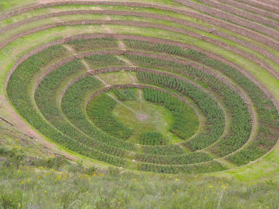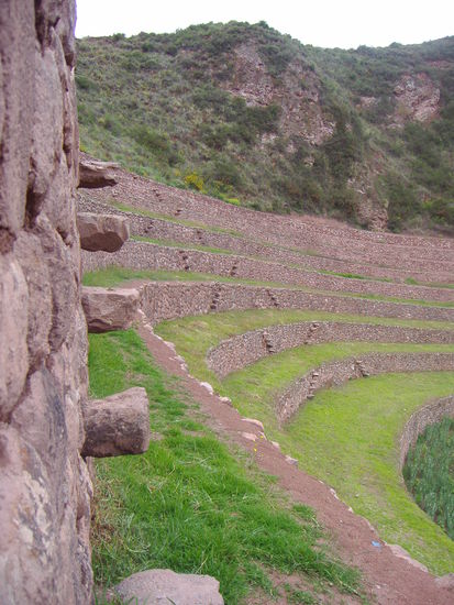 Hier wollten die Inka testen, welches Klima fuer welche Planzen am besten geeignet sei. Laut Reisefuehrer sollen zwischen den einselnen Terassenfeldern Temperaturunterschiede von bis zu 5 Grad herrschen. Das koennen wir nicht so ganz nachempfinden. Wir steigen die abenteuerlichen Stufen bis zur letzten Ebene hinab.