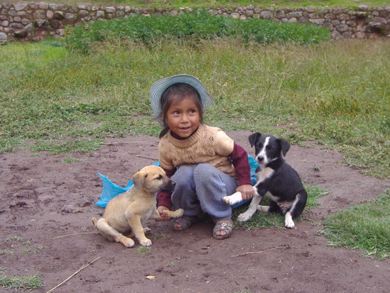 Die untersten Terassen werden noch bewirtschaftet. Unten treffen wir auf ein kleines Maedchen mit ihren Hundewelpen, die sie behandelt wie Teddybaeren.