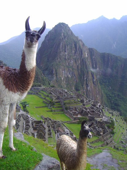 Ein atemberaubender Anblick. Und als waehre das nicht schon das perfekte Foto, treffe ich, als ich um eine Ecke biege auf ein paar Lamas. Die Gefahr eine gefaehrlichen Spuckattacke nicht scheuend, treibe ich sie eine kleine Treppe hinunter direkt vor den Ausblick auf die Ruinen.