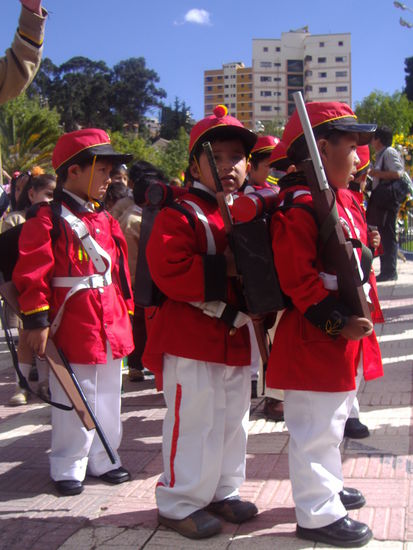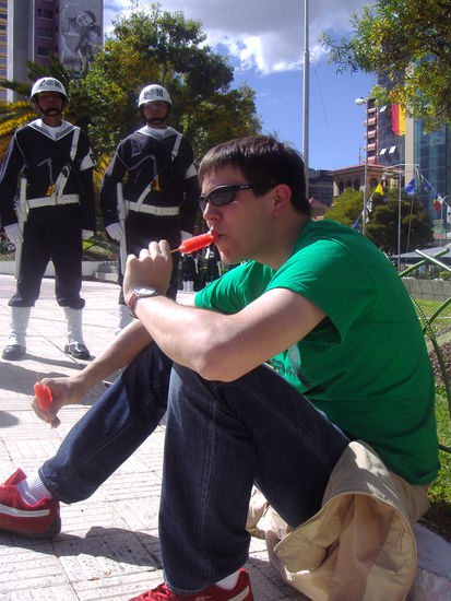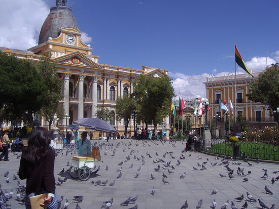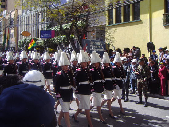 Am naechsten Tag starten wir zusammen mit Chris einen naechsten Museumsanlauf. Diesmal ist auch alles geoffnet und wir gucken uns die Ausstellungen ueber Karnevalsmasken, die bolivianische Geschichte und Ausgrabungen aus der Zeit der Inka an. Als wir gegen Mittag zurueck ins Hotel kommen, ist Yvonne muede und geht wieder ins Bett. Chris und ich wollen das Bomben.Wetter aber nicht im Hotel verschwenden, und beschliessen einfach mal in Richtung Sueden, in das Reichenviertel der Stadt, die so genannte Suenzone zu laufen. Je weiter wir in den Sueden vordringen, desto schicker werden die Gebaeude und die Laeden, in denen die Preise schliesslich sogar nur noch in US$ angegeben werde, wobei sich zwar die Waehrung, nicht aber der Betrag aendert. Ploetzlich stuermt eine Art Sondereinsatzkomando in voller Montur, also mit schusssicheren Westen, Helmen und Maschinengewaehren (oder sowas aehnlichem) im Anschlag an uns vorbei. Wir sind ziemlich eingeschuechtert und bleiben erstmal eine Weile stehen. Aber als wir dann ein paar Blocks weiter laufen, finden wir heraus, warum die Herren so aufgeregt durch die Gegend huschen. Vor einem kleinen Park findet grade eine Art Militaerparade bombastischen Ausmasses statt. Tausede verschiedene Einheiten, zum teil auf riesigen Pferden maschieren, die Nationalhuemne zwitschernd vor einer Art Balkon auf und begruessen jemanden (Chris und ich sind 100 Prozentig davon ueberzeugt, dass das mindestens der Praesident sein muss .